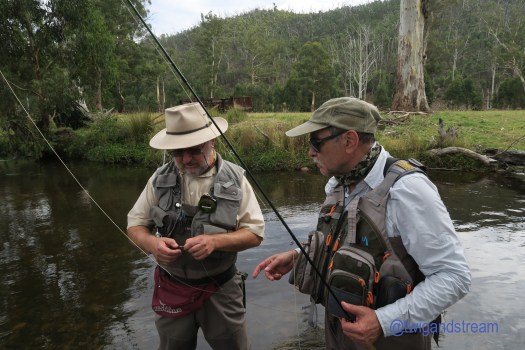 Two clients discussing the fly to choose, on a guided fishing trip with Twig and Stream Fly fishing, Melbourne, Australia. Standing in a river.