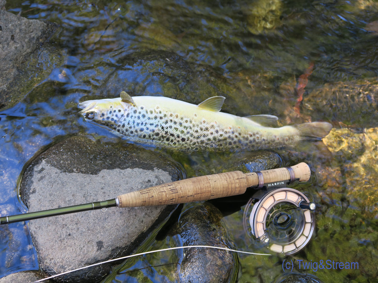 A silver fat brown trout caught in the Victorian mountains fly fishing in Australia, in the water, with a fly rod and reel. Harfin Fly Reel.