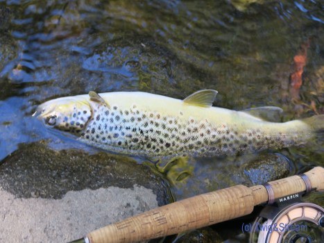 A silver fat brown trout caught in the Victorian mountains fly fishing in Australia, in the water, with a fly rod and reel. Harfin Fly Reel.