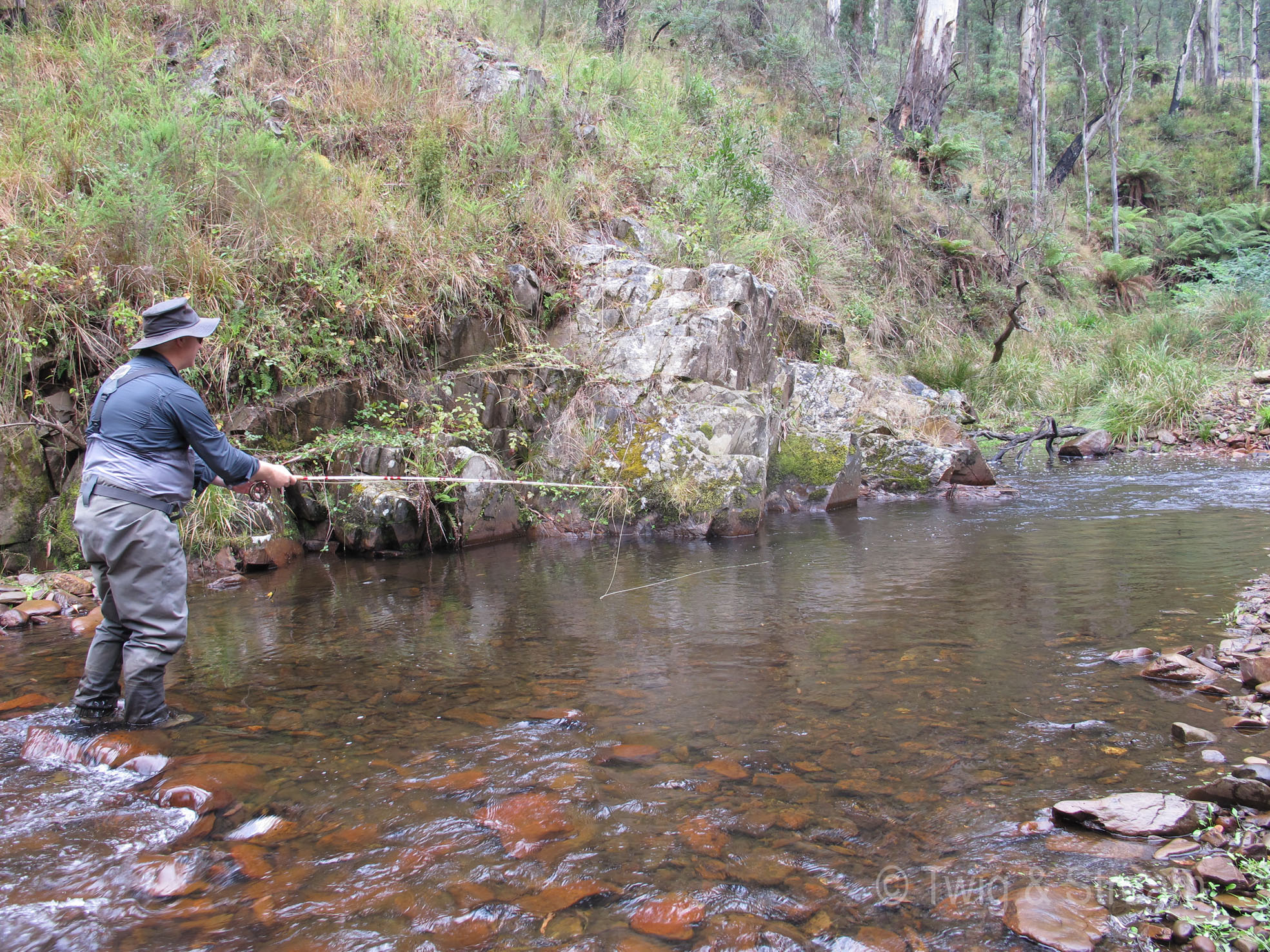 You can see the moment the wild brown trout rose and took the dry fly. That was cast by the man in the photograph using his fibre glass rod. Guided fly fishing in Victoria Australia.
