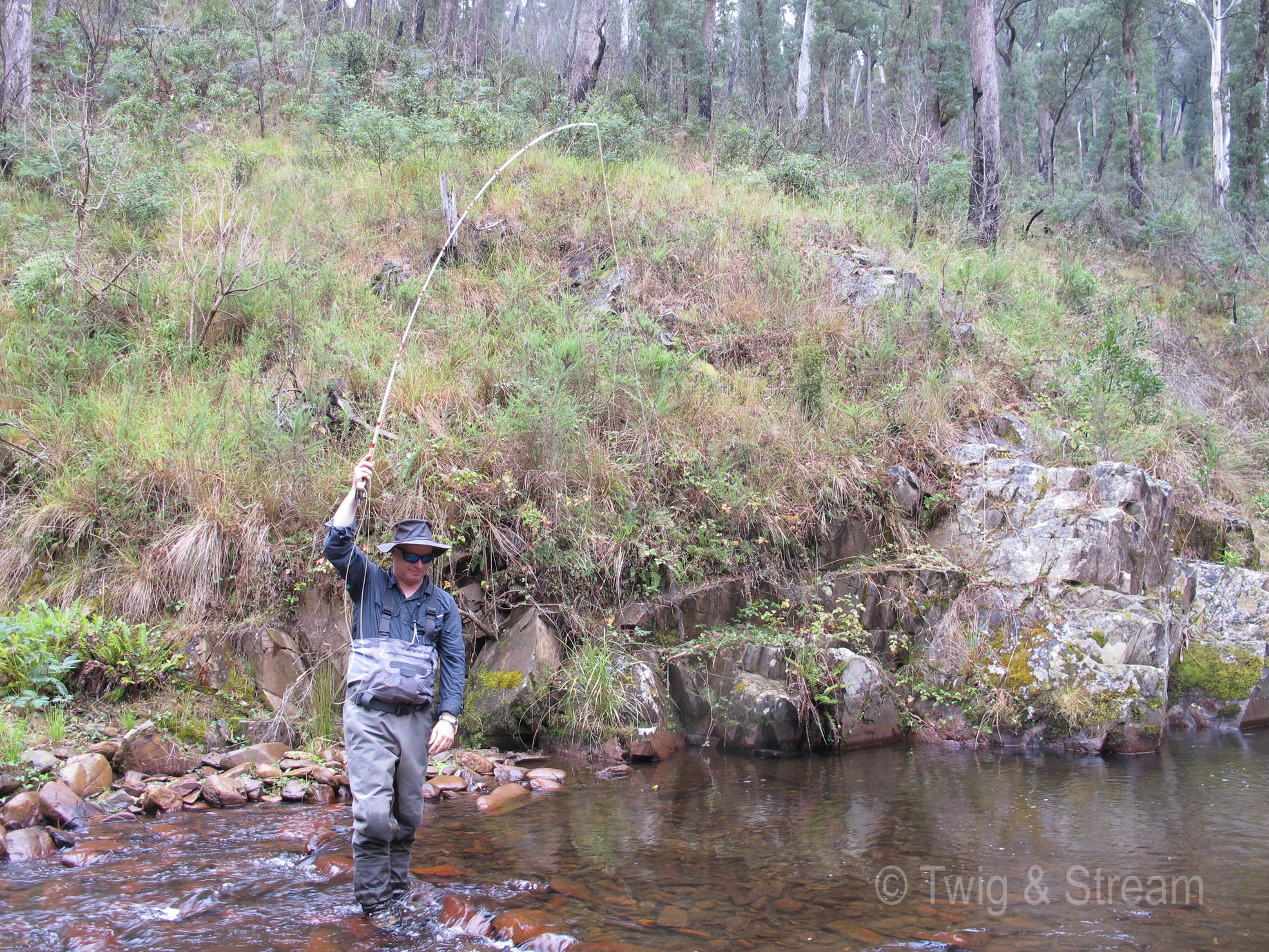 Previous Image Next Image IMG_3773 Rod high, protecting a light tippet Man fly fishing for trout in the Ovens Valley Victoria Australia, using a fibre glass rod.